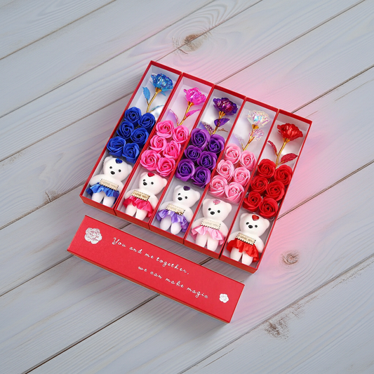 Plush Bear Gift Box with Soap Rose Flowers and 24K Gold Foil Rose Romantic Keepsake