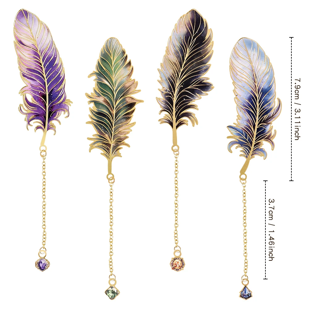 Mark every chapter with meaning. This elegant metal bookmark features a vibrant feather design paired with a delicate chain pendant, creating a timeless keepsake for readers who cherish beauty as much as stories.