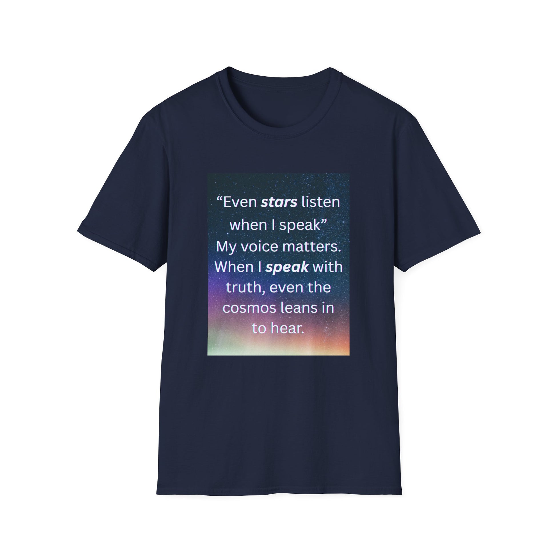 Featuring the empowering quote, “Even stars listen when I speak,” this Unisex Softstyle Tee is a tribute to self-expression, confidence, and mindfulness. Crafted from ultra-soft, breathable fabric, it offers the perfect balance of comfort and style.
