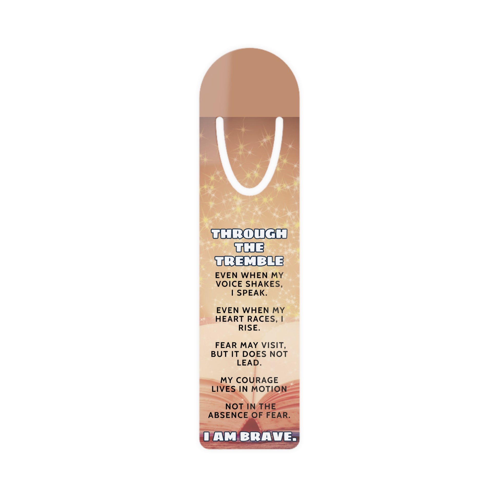 Find strength and courage in every page you turn. The I Am Brave Bookmark is a daily reminder that even when your voice trembles, your spirit remains unshaken. Featuring the empowering words “Through the Tremble, I speak. Even when my heart races, I rise. Fear may visit, but it does not lead. My courage lives in motion—not in the absence of fear.”